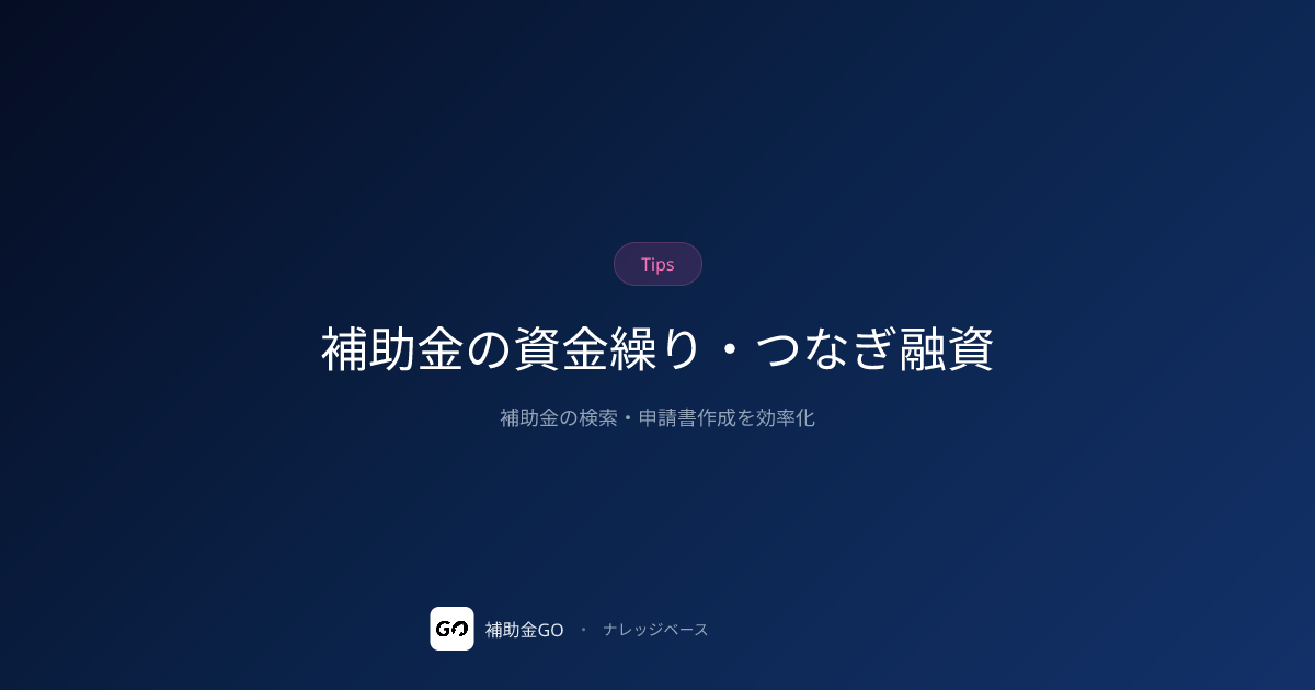 補助金は後払いが原則で採択から入金まで8〜14ヶ月。つなぎ融資(公庫・制度融資)と自己資金の3パターン、年1〜3%のつなぎ融資活用法、キャッシュフロー管理5ポイントを解説します。